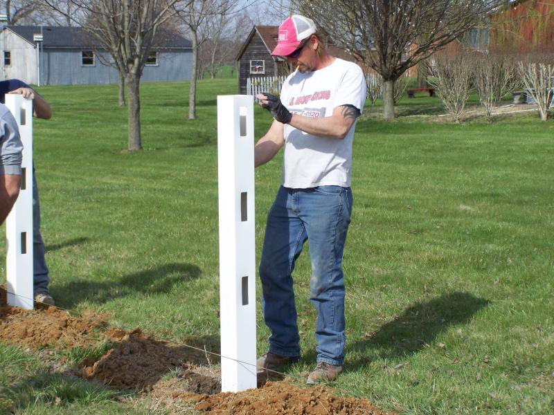 The crew is hard at work setting the posts in concrete. Once the concrete is in we make sure the post is straight by checking it with a level.